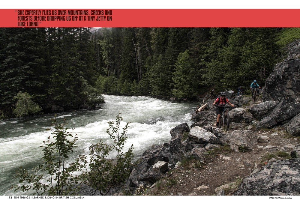 Our first trail starts at a place called Lorna Lake, at the Southern end of the South Chilcotin mountain range, but we can’t get there by car, or on foot, or even on bikes. We get there by packing all our bikes and kit into a small De Havilland float plane, which is 61 years old, and trusting our excellent pilot to take off from the surface of Tyaughton Lake, some 45 minutes south of our trailhead. She expertly flies us over mountains, creeks and forests before dropping us off at a tiny jetty on Lake Lorna and leaving us to our own devices.