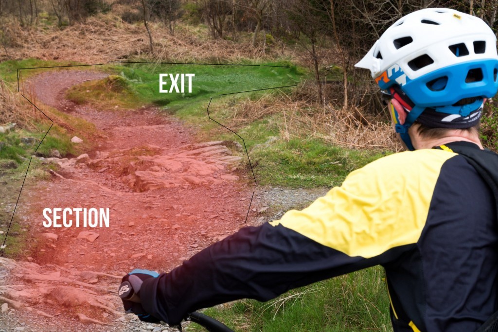 Let your eyes scan ahead plotting your route reading the bigger picture up to the trail horizon (the furthest point you can see at any time) and back again towards your front wheel (but not directly at your wheel) to check if you are still on target.