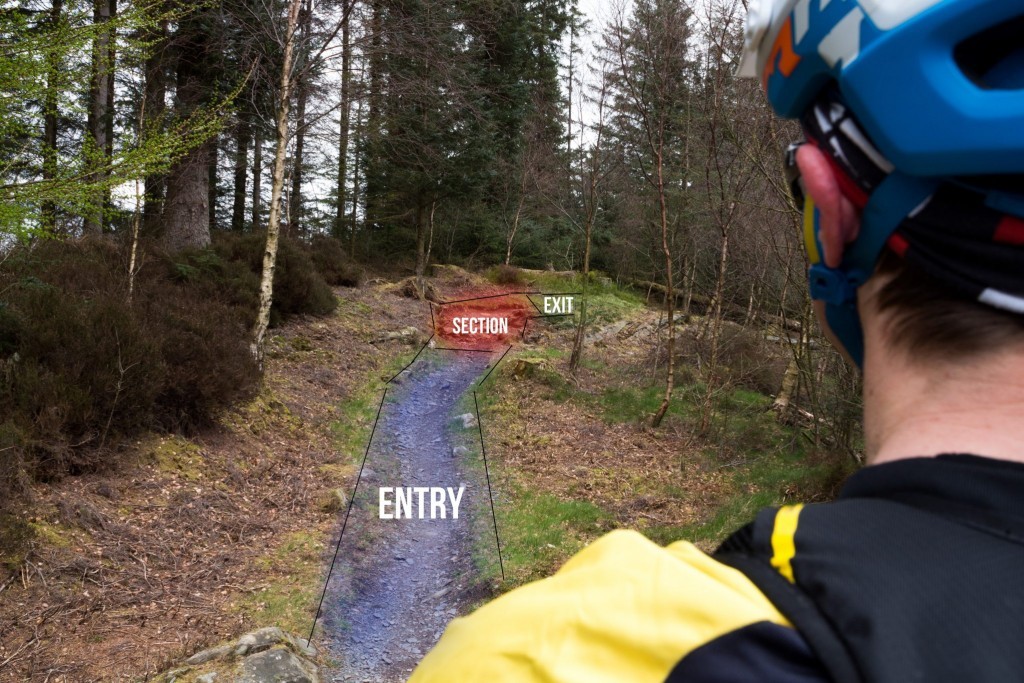 IMPORTANT…The only thing that is constant is change. Do not make your desired line choice a ‘fixed ideal’. Sure as eggs are eggs you will at some point slither, slip, ping or pop off from that line as tyre contacts root, rock, ridge thus redirecting you elsewhere. A quick scan and adapt will enable you to maintain control, plot and navigate your new course.