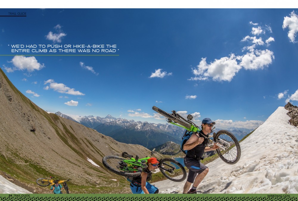 Days three and four both started with long fire-road climbs, which of course we could have uplifted if we’d not already decided to dispense with such luxuries. It has to be said though that the descents tasted that bit sweeter for all the effort we’d put in and all the sweat we’d wiped from our brows. Pausing for a break at the top of each climb was a time to mentally regroup, relax for a moment, and take in all that lay before us – over every mountain pass, there was a different vista, different backgrounds, and layer upon layer of distant snow-capped peaks. Lying down in the cool alpine grass taking in a few snacks, a drink and the silence of the mountains was the perfect way to prepare for each long descent that lay ahead. In contrast, if you’re using an uplift service then you can easily fill your day with two or even three big descents, depending on how close the van can get to the top of the climb (and therefore how much on-bike ascent there is left to do).