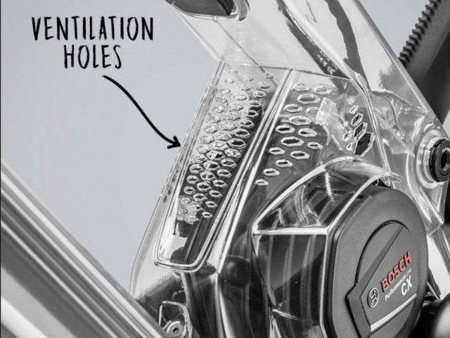 As the Patron eRIDE motor is supported from underneath, its top part seats in the open air, therefore, like a chimney the air is free to go out. This ventilation steam is even reinforced when you ride thanks to the holes on the cover.
