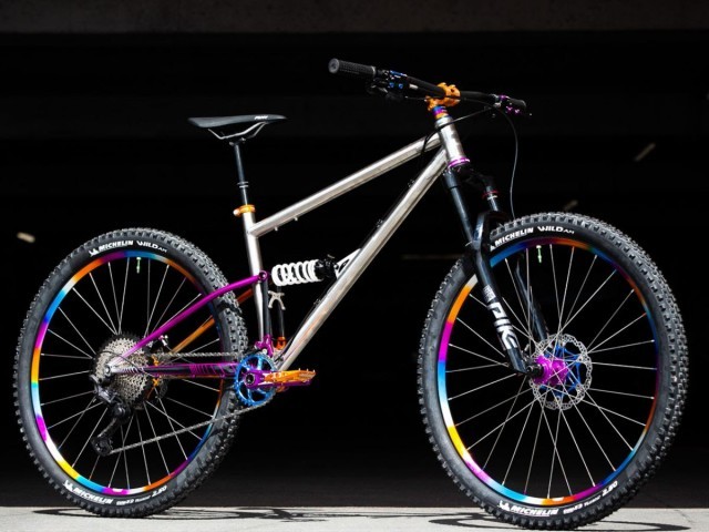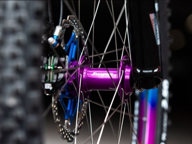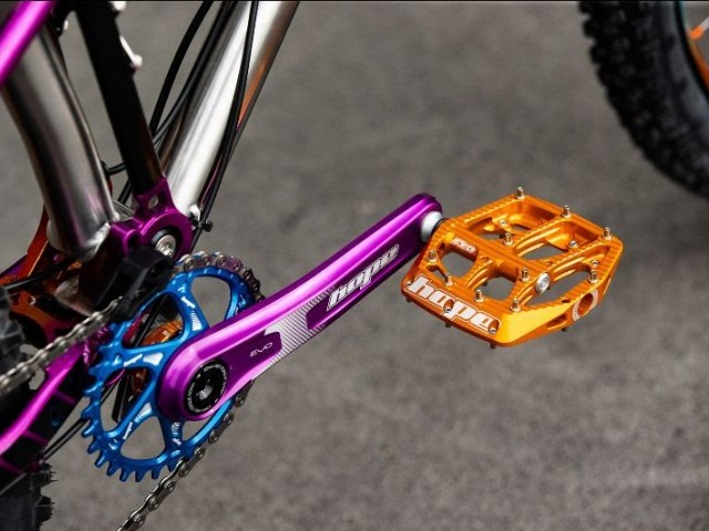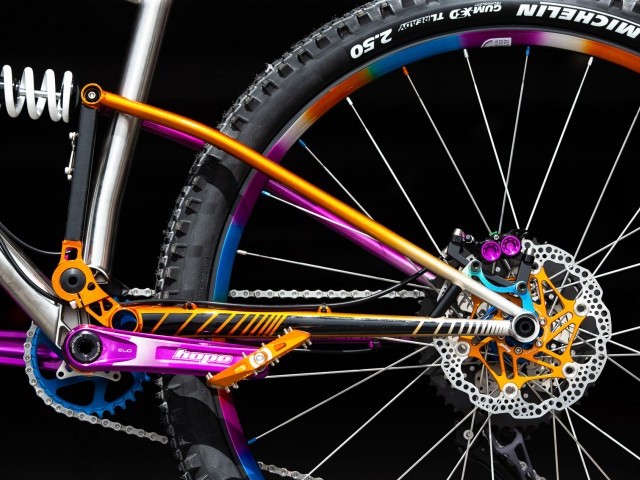 The age-old mountain biking truth ‘anodizing equals eye-catching’ rings true on this one, and Hope supplied some absolutely stunning anodized parts for this. Choosing all 4 of their ano colours felt a little over the top even for this build, so Starling chose 3 – blue, orange and purple. They selected as many Hope parts as possible and tried to have every part next to a different coloured component.