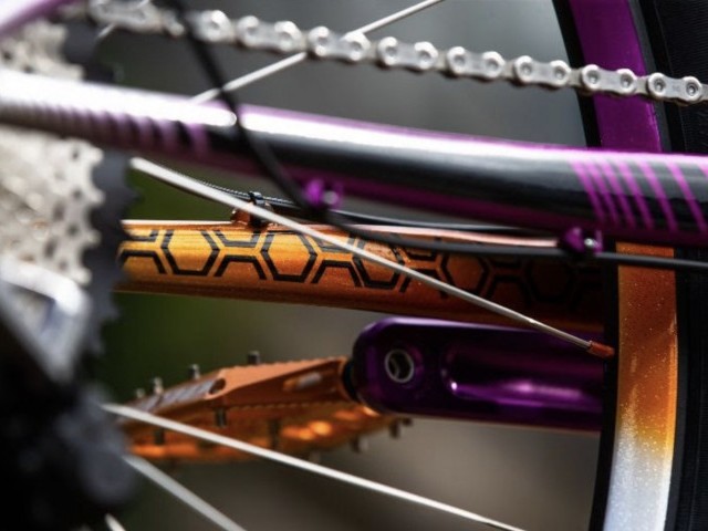 Next was the the help of Bristol Bike Restorations for a custom paint job. Josh was given free reign to use his own creative interpretation and he created a smooth fade between colours and some nice hex details to match the Hope components.