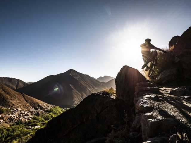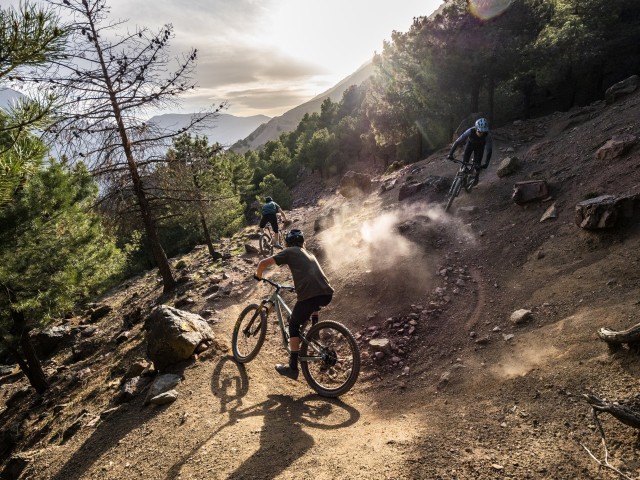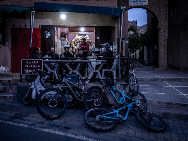 We meet old friend and local mountain bike guide Lahcen at a stone café high on a pass overlooking the sleepy village of Imlil. Just south of us, the 4 167-metre-high behemoth that is Toubkal, Morocco’s highest peak, juts skyward unapologetically raw and brutal in appearance. Sipping on sugary mint tea we catch up on old times and hear how for the last two years tourism’s lifeblood of the village was put on hold by the pandemic. And then, fuelled by the sweet tea and a fidgety, collective energy we are back on our bikes, launching into a loose, clattering, serpentine trail that cuts back and forth through shady pine forest. Bringing up the rear and peering through the cloud of dust raised by ten tyres ahead of me, I can just make out the silhouettes of riders carving high lines into tight bends or throwing whips over boulders —lines and shapes I’d never have thought of adding to a Morocco descent.