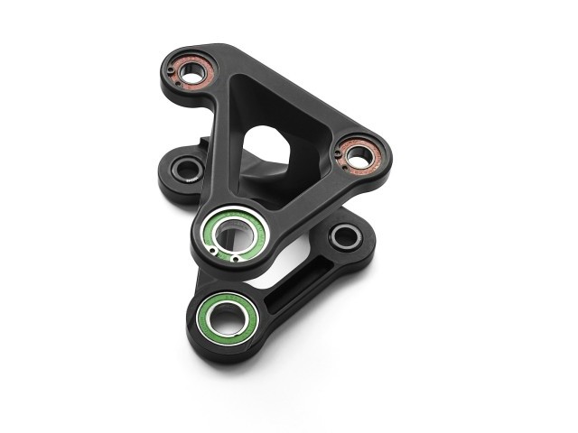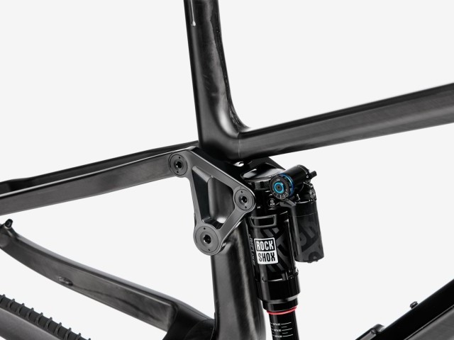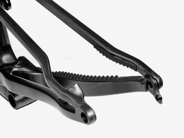 The progressive kinematics of the Tarvo are realized with the suspension system based on a flex pivot and a rocker arm. The directional stiffness of the carbon material is used to form an elastic joint. This is lighter and completely free of play, wear and maintenance. This is made possible by the optimal choice of pivot points, so that the flex pivot, despite the large travel, is hardly stressed and thus achieves optimum durability.