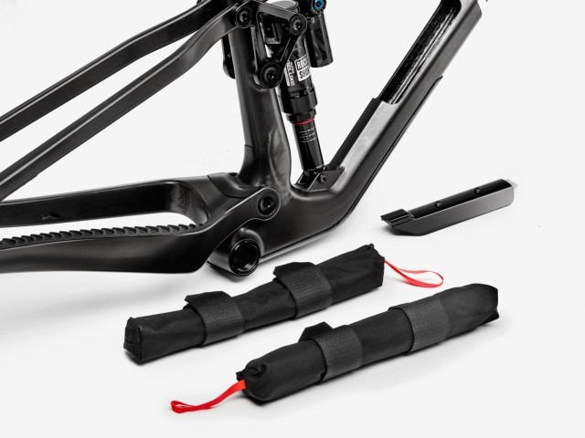 The in-house laminated down tube protection covers the down tube and the bottom bracket area extensively and protects it very effectively. The protection is glued on to create no weakening at the frame by screw points. For bonding, we use a double-sided adhesive foam film, which also has a shock-absorbing effect.