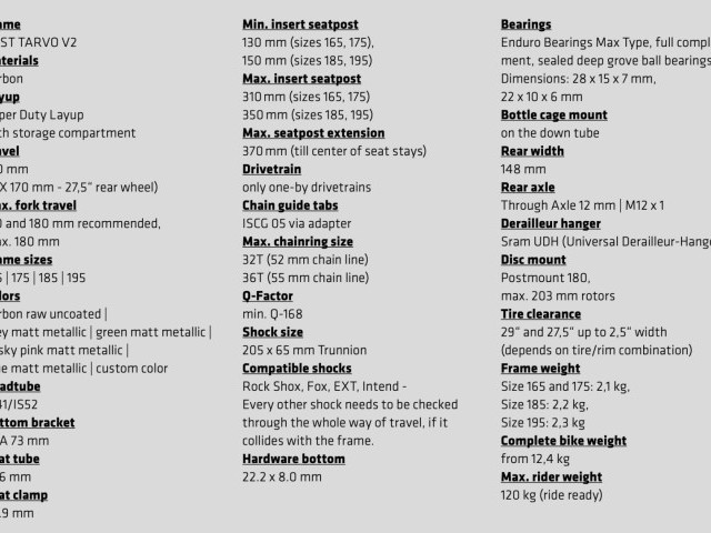 The new Tarvo allows for the first time to use forks up to 180 mm travel. This allows racers and bike park riders to step up the capabilities of the bike. Due to its balanced ratio of reach to chainstay length, the Tarvo is lively and playful. The flat head angle generates a lot of control and the bike can be steered precisely and directly. Chainstay length and seat angle are optimized for each frame size. The effective seat angle is always given in relation to the assumed seat height. Last takes into account that the rider will also sit higher with increasing frame size. The short seat tubes and the very good retractability of the seat post allow every rider to choose between several sizes – depending on their preference for a longer or shorter bike. To give a starting point for size selection, the sizes are named according to typical rider sizes in centimeters: 165, 175, 185 and 195.