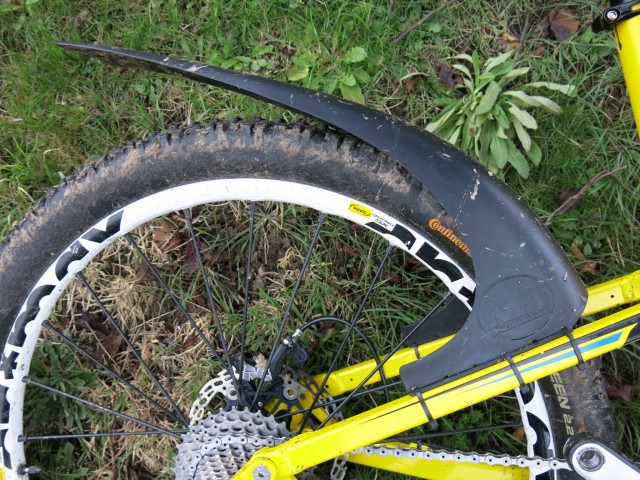 The rear mudguard is far less conventional, but far more effective than previous guards we have used. It cable ties onto the rear seat stays of your bike, it works with full suspension bikes or hard tails. Ensure you follow the fitting instructions and use the provided helicopter tape to protect the frame. You can crank the cable ties really tight and it won’t budge. By putting the guard really close to the tyre, they recommend just a 10mm gap; you still get full travel out of your bike and also plenty of protection from flying dirt. It’s so solid on the bike you have to try it to believe it, OK the styling of mud guards may not be to everyone’s tastes, and we have certainly had mixed response about the rear guard, but it does a fantastic job of keeping your bum clean, which will keep your landlord happy for your after ride pint in the pub!