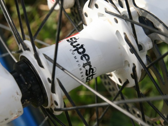 Our wheelset sports white Switch hubs that are laced via Sapim spokes to 30mm wide electric blue AM-490AM rims. Considering the price these handbuilt wheels look fantastic. Forged and CNC machined hubs have full cartridge bearing and the rear has 3 double pawls that give excellent pick up.