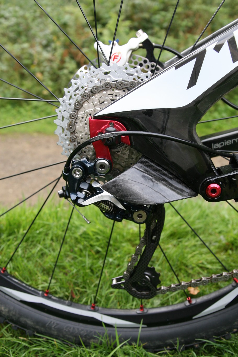 The rear triangle of the 714 and the top end 914 are carbon. Not only does this save weight over the lower spec models with their alloy rear ends but it also offers more tyre clearance on the drivetrain side. A 2.3" is borderline on the 514 and 314 but the carbon rear can happily take a 2.4". The rear dropouts are standard quick release but there is no hint of a lack of stiffness due to the seat stays flaring massively at the bottom.