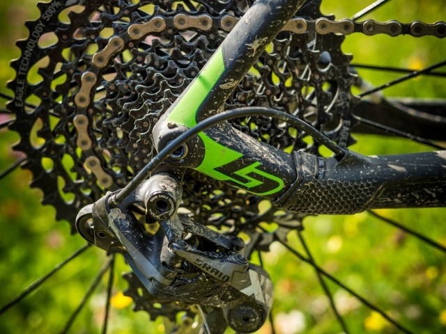 The medium we tested was a very well balanced machine, long enough TT coupled with a short stem and a 69.5 deg HT angle to give a fast reacting cockpit without feeling cramped. 720mm bars would be as narrow as I’d want but felt perfectly adequate. The eagle chain set, smooth flawless shifting with a gear for every occasion. I also liked the tyre choice, both Maxxis, a good sized 2.25 ardent up front and a 2.2 ikon on the rear. Good to see functionality over thin weight saving options.