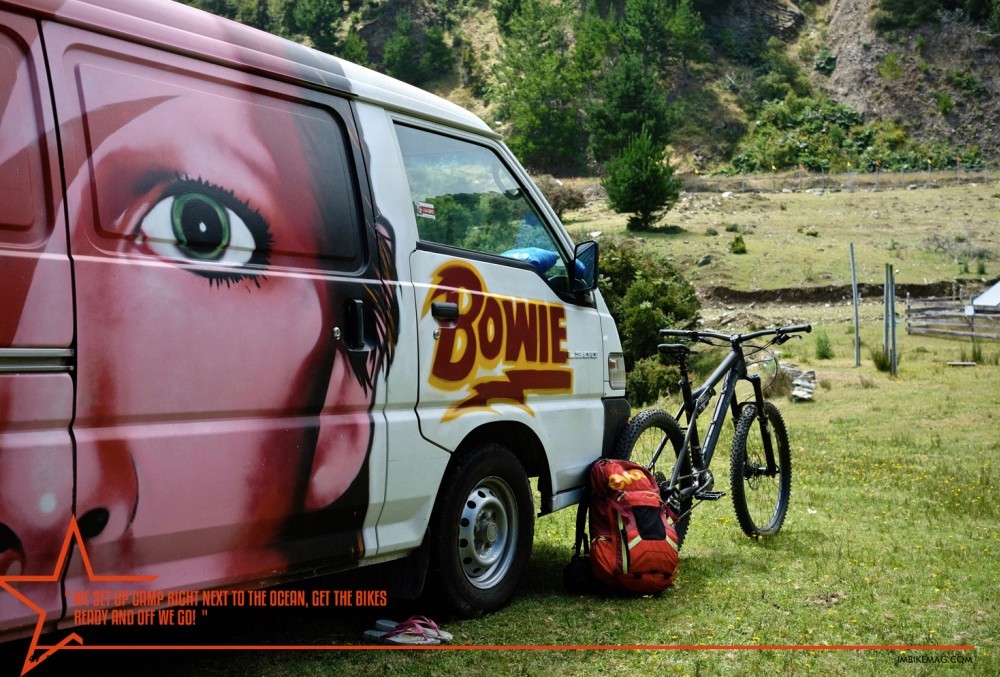 Meet Bowie: our transport for the next few weeks. Only 30.000 km old, but without all the comforts of a modern car: no central locking, no air conditioning, no radio. But: a cooking area, a bed, and enough space for all our gear. And on the outside: David Bowie. Ziggy Stardust, Rebel Rebel, Heroes – our van shows the greatest hits of David Bowie, and we are looking for the best hits that Chile has to offer for mountain bikers.