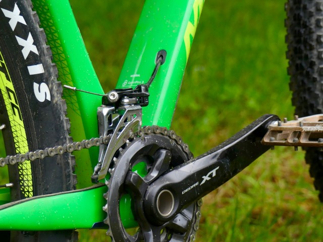 The spec sheet gives us a race ready machine, with full XT kit covering transmission and braking. The front mech seems unusual as surely the type of rider who's into this bike would have strong enough legs to push a single ring but hey, you can always take them off. The wheels are Deore hubs, which lack any bling, but are very serviceable and are built with Merida's own brand rims. Things stay lightweight with a carbon seat post, and the classic long stem and narrow bars are again from the Merida catalogue.