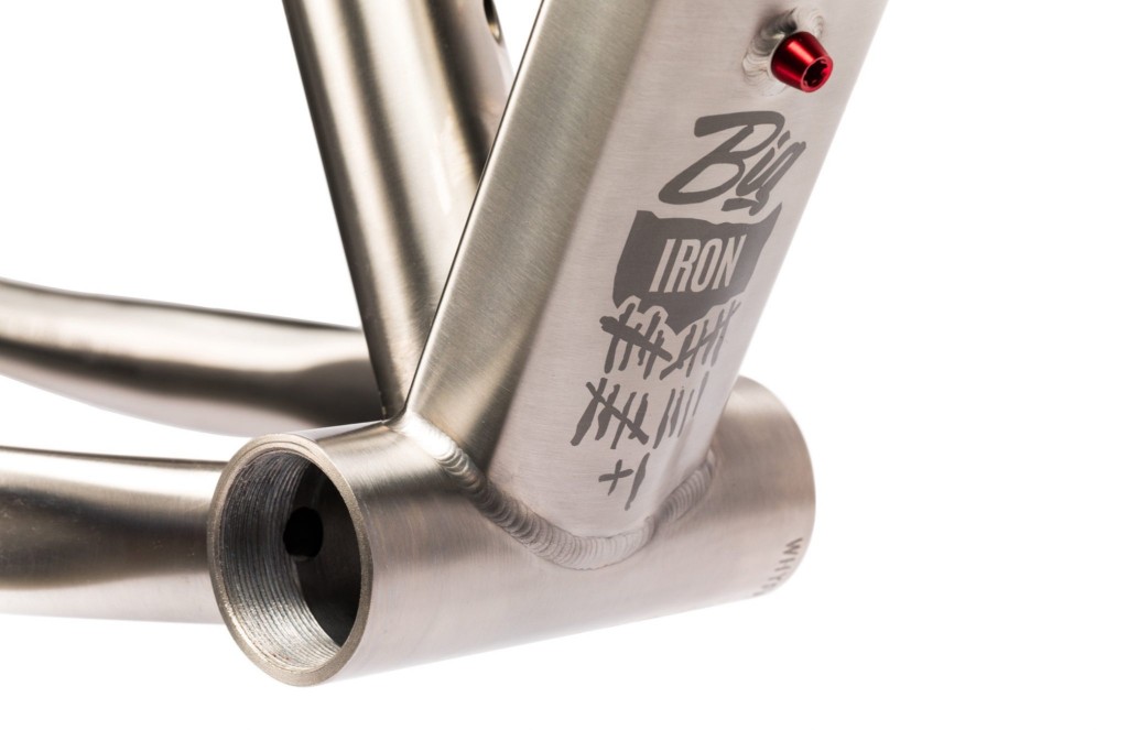 According to Why, the Big Iron is made from the same superior Grade 9 titanium as their other models, with a machined 6/4 titanium integrated head tube, threaded bottom bracket shell, stealthy belt drive split, and sliding dropouts. It has extra water bottle bosses, rack and fender mounts.