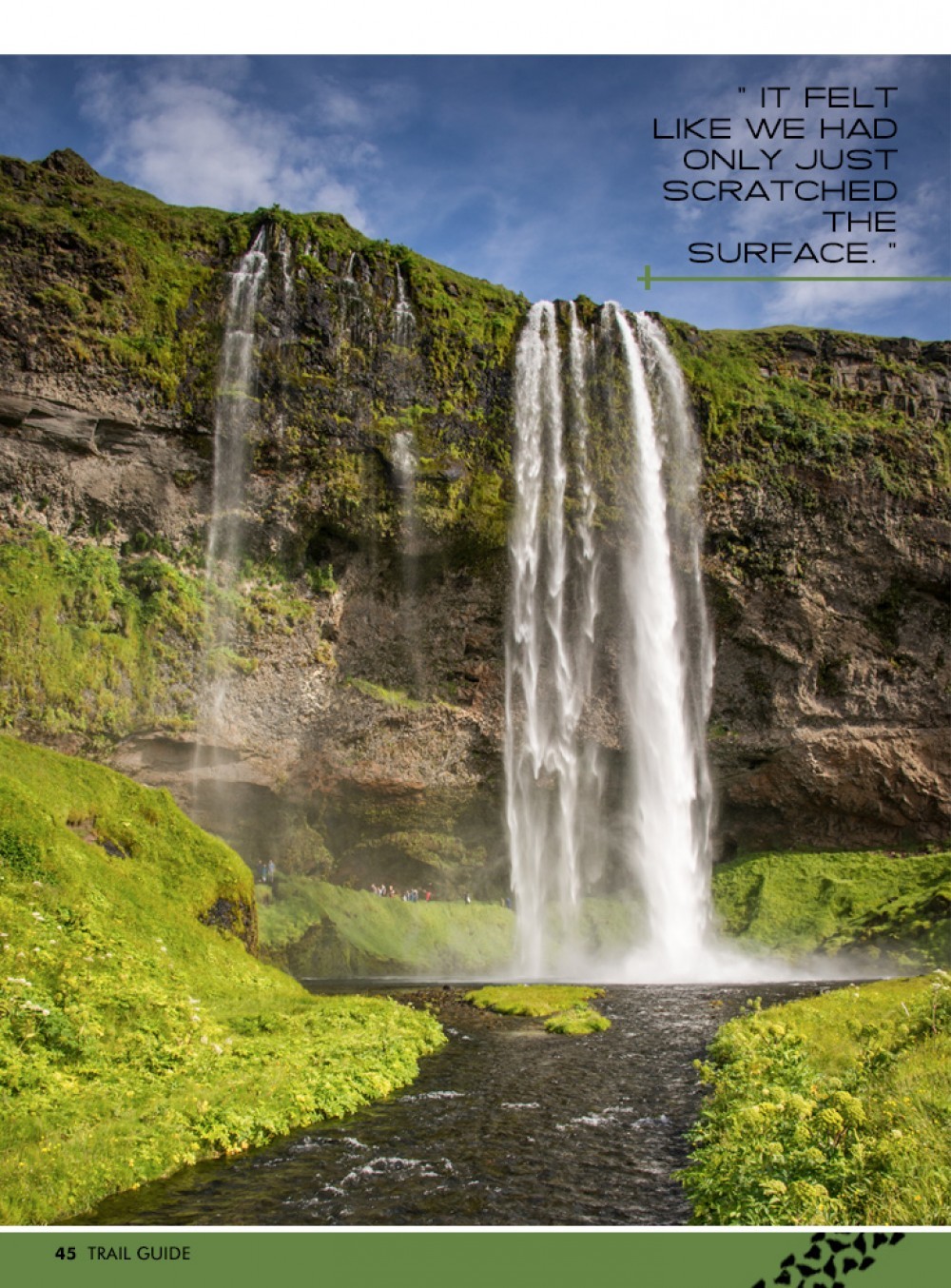 The view was a panorama like nothing else I had ever seen. All along the horizon distant ice caps glinted in the sun underneath bluebird skies. Vivid green slopes draped in ribbons of snow soared upward to rocky summits, the only sound the hiss of a gentle breeze. My eye traced the line of the trail from beneath our feet, swooping down the broad ridge in front of us, descending steeply all the way to the plateau and into the distance. This was going to be special.