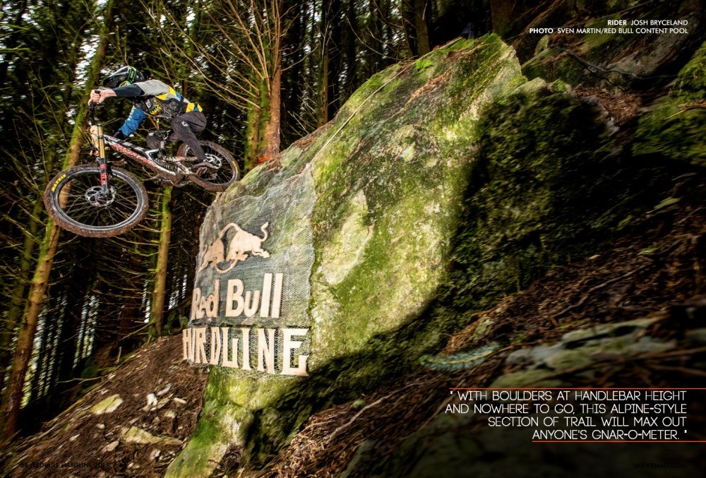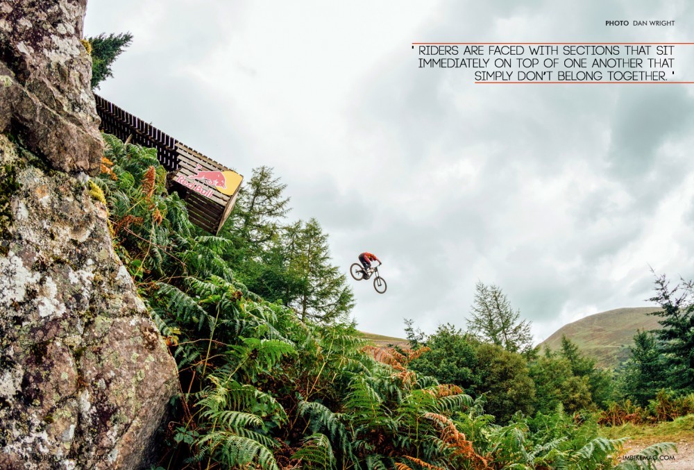 A dirty, rocky edge hides the drop below, the right-hander after the plummet just seems near impossible to make, and the drop itself is hugely intimidating. Hiding under the drop, the bedrock protrudes forcing the riders to huck further down the insanely steep gradient towards the corner. If they clean this, it's on to the fast rough exit to the woods and the ginormous Cannon Gap.