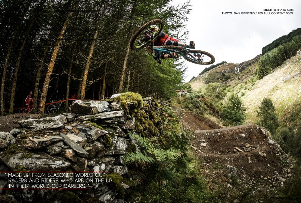 The Step Down, another huge feature, takes the riders into a monster left-hand berm before immediately popping over another enormous step up jump. A few slick berms and into an off-camber woods section where it's hard to carry speed, this is needed not just for a fast run but to clear the step up hip jumps that pass over the old dry stone wall (Off The Wall section) as the trail cuts in and out of the tree line. With blind landing zones and takeoffs that have to be taken while on the turn, this section continues to prove itself difficult for the worlds best, making Waterfall Edge a popular spectator point.