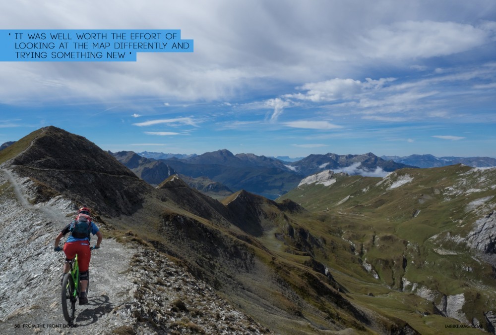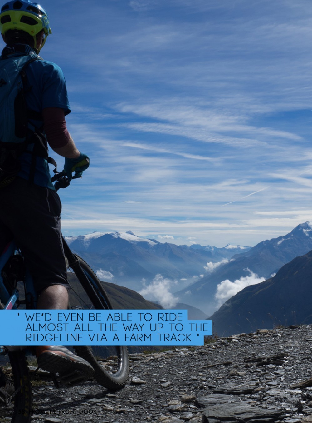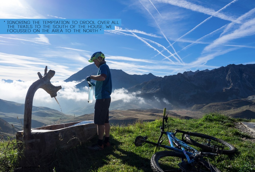On the way up, we’d taken the opportunity to eye-ball the trail options descending off in various directions. We had considered continuing past the refuge to another high pass, and coming back down from there, but it didn’t look too great from a distance – almost directly down the fall-line, with little opportunity to get off the brakes. The option of riding back along the ridgeline had looked much more inviting – less steep and more flowy. After putting the effort into getting up there, it seemed a much better idea to eke out the elevation by taking a mellower descent.