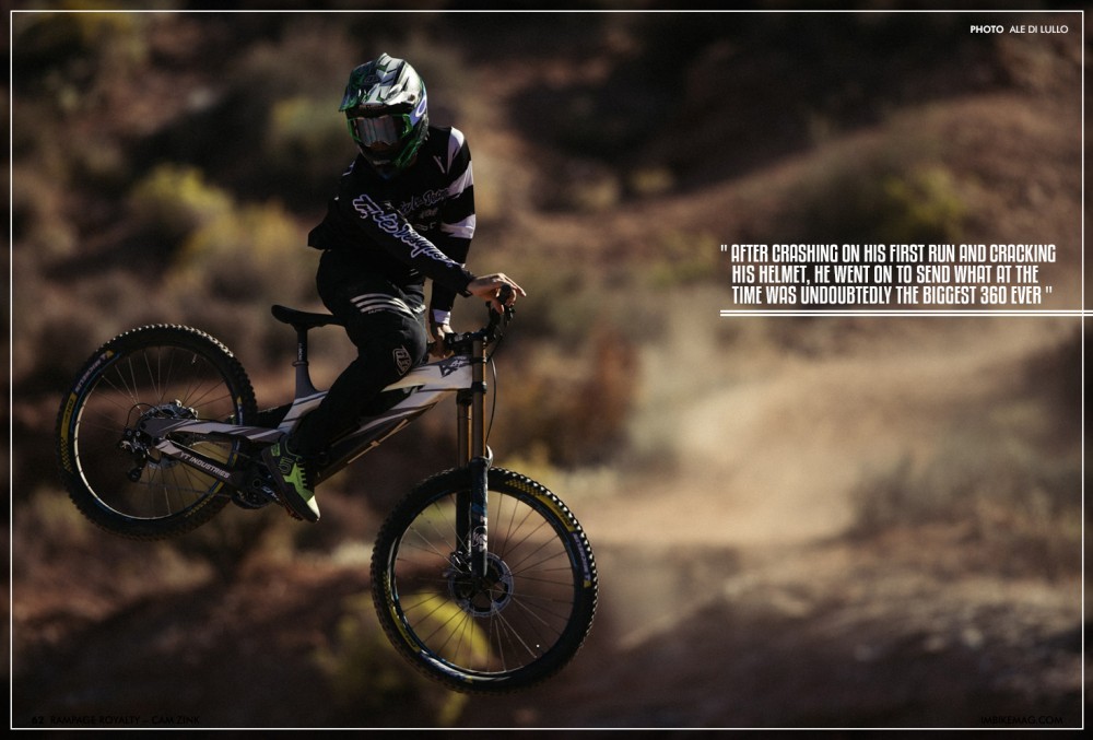 One man who has consistently taken the fight to rampage is Cam Zink, famous for going huge and pushing the sport forward. Most notably in Rampage history was Cam's ridiculous 360 back in 2010, which sealed the win as he launched off the enormous wooden drop that was the style of some features at the time. After crashing on his first run and cracking his helmet, he went on to send what at the time was undoubtedly the biggest 360 ever. In 2013 Cam wowed us all yet again with a huge 78ft step-down backflip that blew everyone's minds and is still hugely impressive even by standards today.