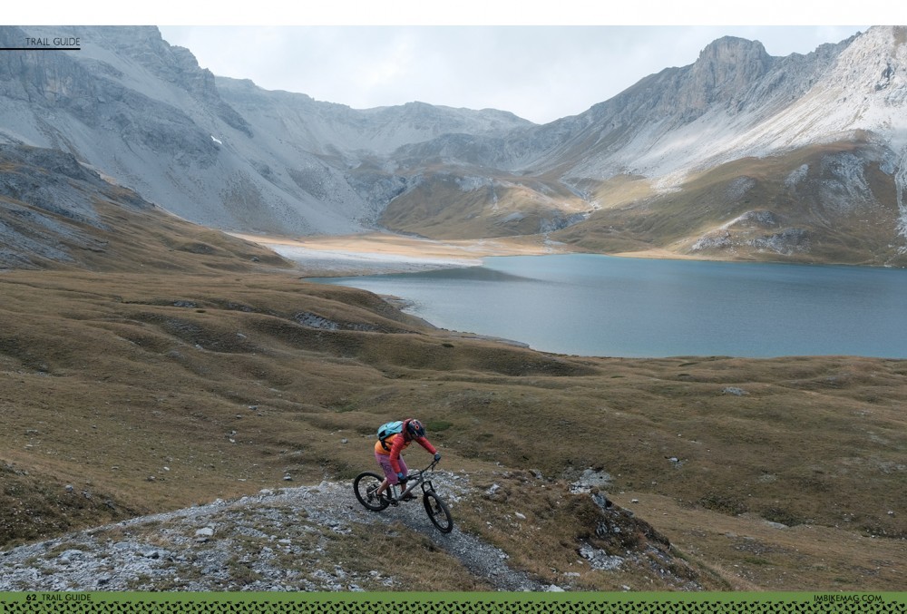 The further we ride down, the more we warm up and start to really enjoy our descent. The trail itself is incredible – crossing a moon-like landscape, it always seems to have the ideal gradient and we can let go of the brakes and cruise down towards the “Lai da Rims”, an incredibly scenic mountain lake. How cool would it be to go for a quick swim here? Well, maybe in summer…