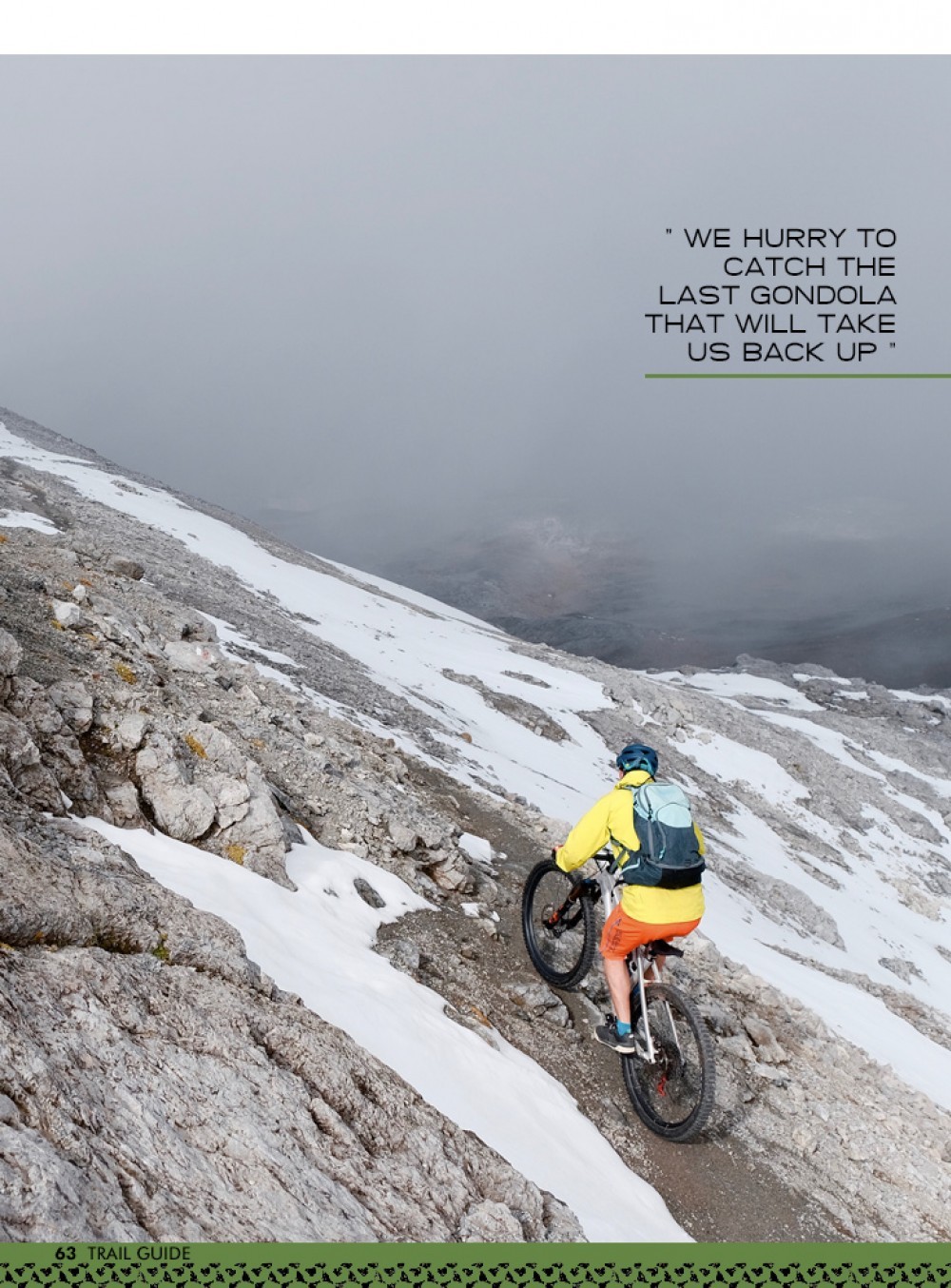 At around 2000 meters, the trail drops into the deep forest and ends just before the small village of Trafoi, where we hurry to catch the last gondola that will take us back up, for the start of the second half of our descent.