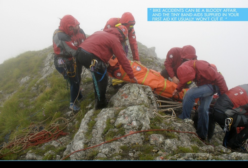 First of all, make sure your kit bag is waterproof, or carry it in a dry bag. Pouring rain shouldn’t affect your first aid kit. Make sure the bag is a bright colour too, so it’s easy to find in case of an emergency. Mountain bike crashes are usually high-speed tumbles that result in gashes and flesh wounds or low-speed stacks with high force impacts. The high force impacts tend to lead to torn ligaments, fractured bones or dislocated joints. While the high-speed get-offs generally have open wounds nicely filled with dirt and sand as a result.