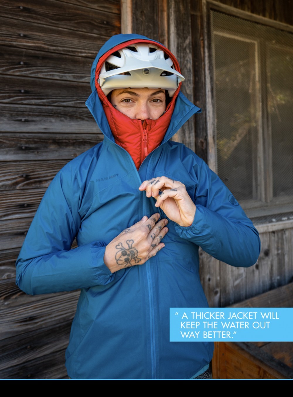 Another layer where price really is linked to performance is your rain shell. This layer is there to protect you from the elements. Lighter materials are more breathable, making them better for when you get hot and sweaty on the ride. Sadly they do tend to lose their waterproof ability quicker. When the day will be filled with downpours, a thicker jacket will keep the water out way better. Check if your jacket of choice has some sort of straps on the wrists, and vents underneath the armpits. Those make a world of difference.