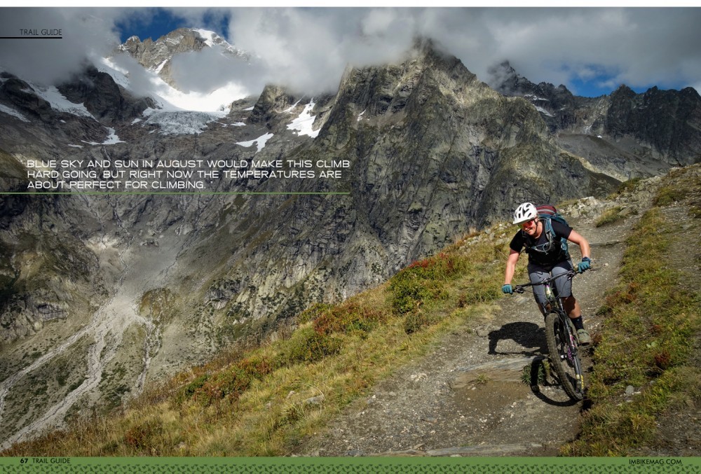To descend simply turn around at the col and head back the way you came, only this time passing the Bonatti refuge, then either descending directly to the valley floor or taking an undulating traverse on a short section of the Tour du Mont Blanc trail, to one of the later singletrack descent, depending on how busy the trails are and how much time you want to spend.