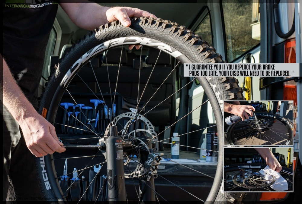 After giving your bike a good wash, take out the wheels. Just because you threw some water on it, doesn’t mean the bike is clean. Grab a can of brake cleaner and a clean rag. Give the discs a good clean, and check if they are not worn out. Most brands have a minimum thickness requirement of 1.8mm, and I guarantee you if you replace your brake pads too late, your disc will need to be replaced.