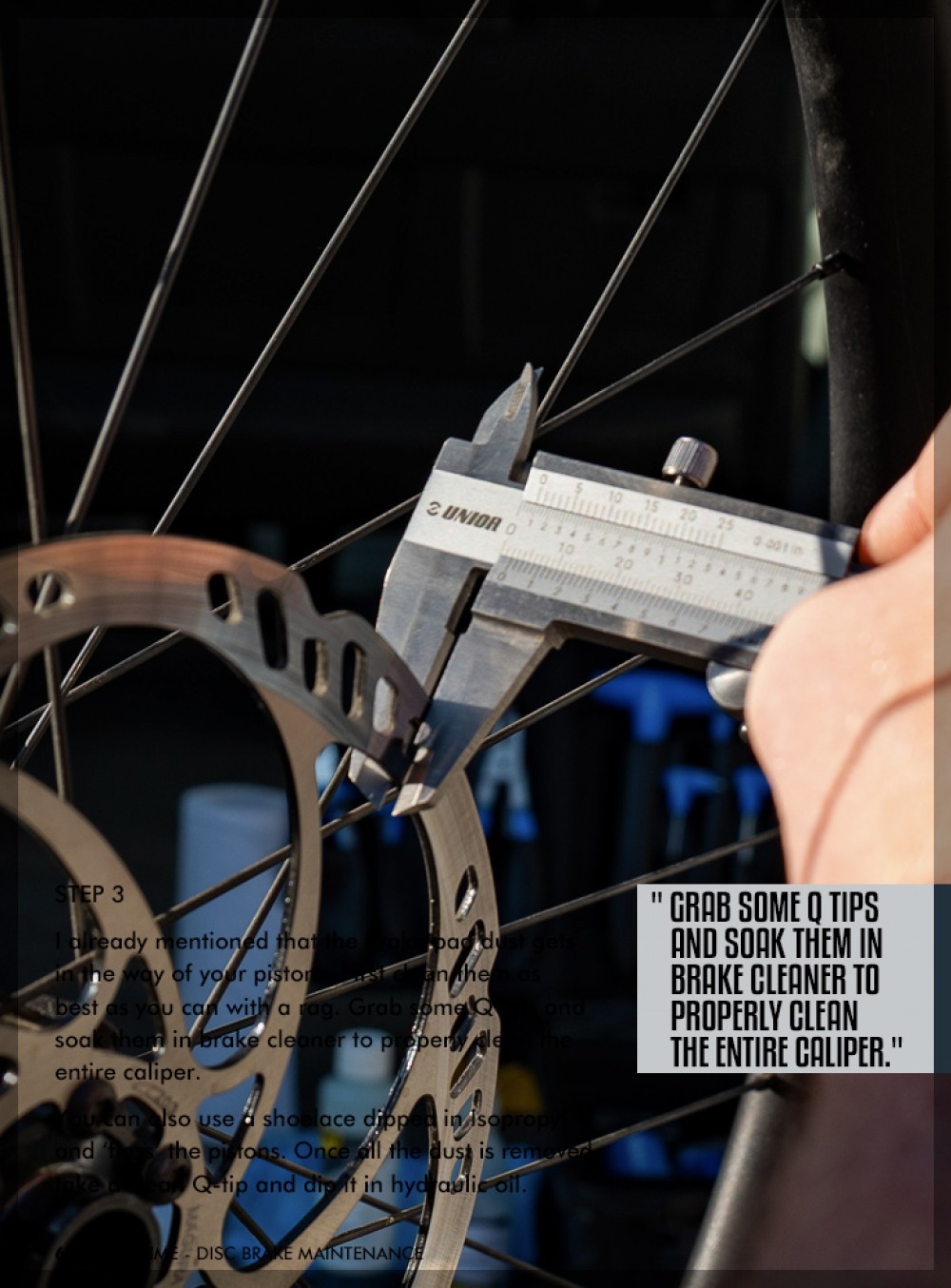 You can also use a shoelace dipped in Isopropyl and ‘floss’ the pistons. Once all the dust is removed, take a clean Q-tip and dip it in hydraulic oil. By rubbing a tiny amount of oil on the sides of the piston, you make sure they can move smoothly in and out of the caliper again. No need to overdo it though a tiny little bit is enough.