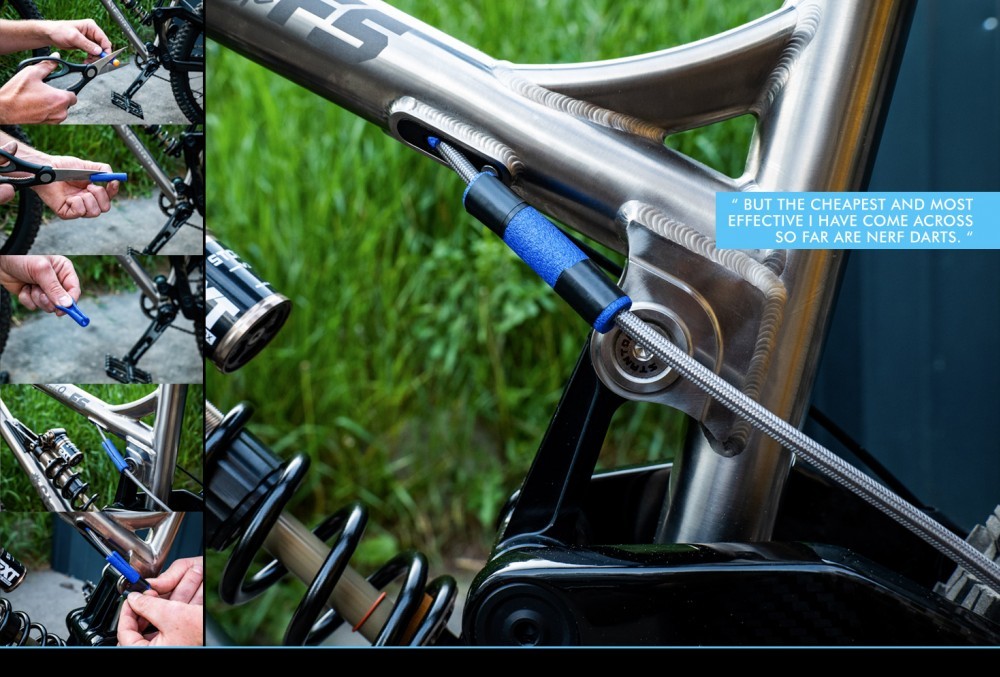 There are several different solutions, but the cheapest and most effective I have come across so far are Nerf darts. Yes, those things from the Nerf guns. You can also go for the official Jagwire Internal Cable Dampeners but you can find the darts anywhere and they’re dirt cheap too. Just cut off the tip, slide them over your cables and push them into the frame. If you don’t want to remove the cables you can even cut them lengthwise and use some tape to stick them back together again. Add as many as needed to stop the cables from making noise.