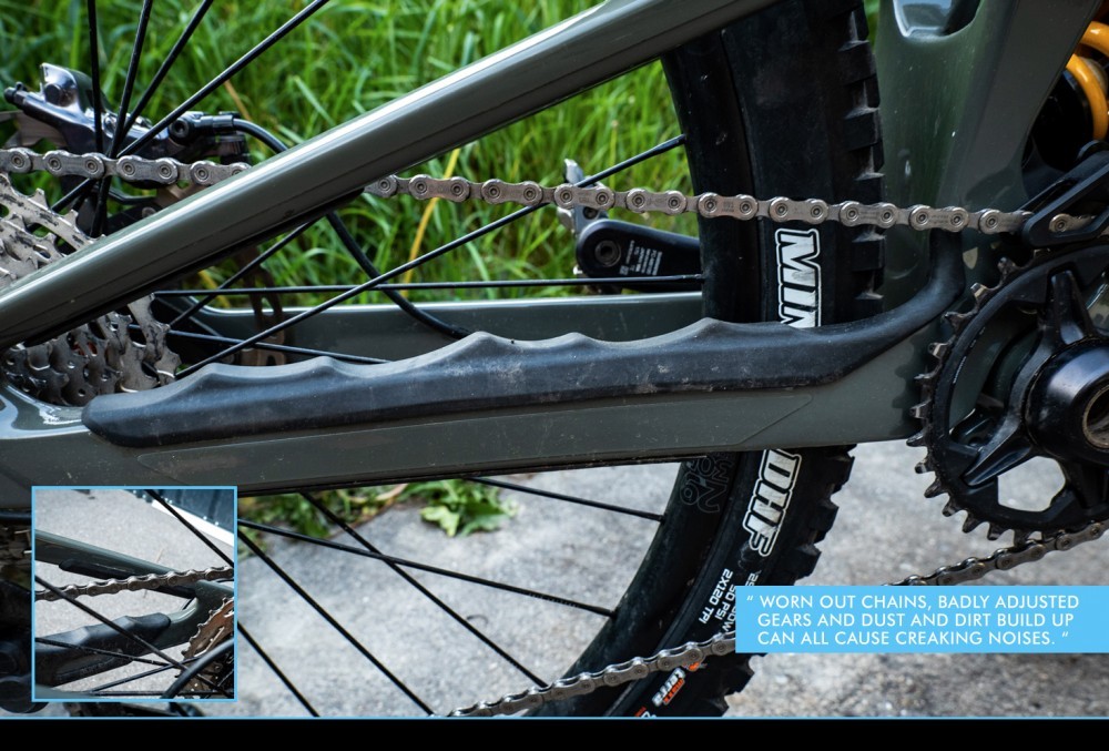 Of course there can be a plethora of different causes for a noisy bike. Most of them are related to how much love and cleaning you give your ride. Worn out chains, badly adjusted gears and dust and dirt build up can all cause creaking noises.