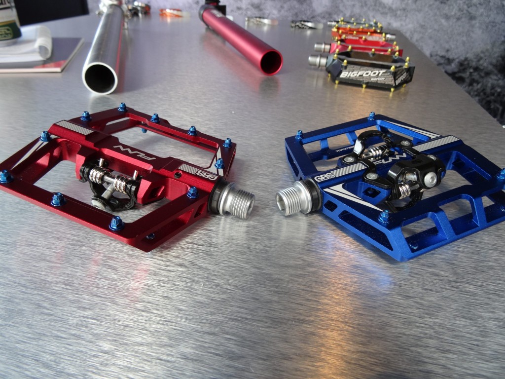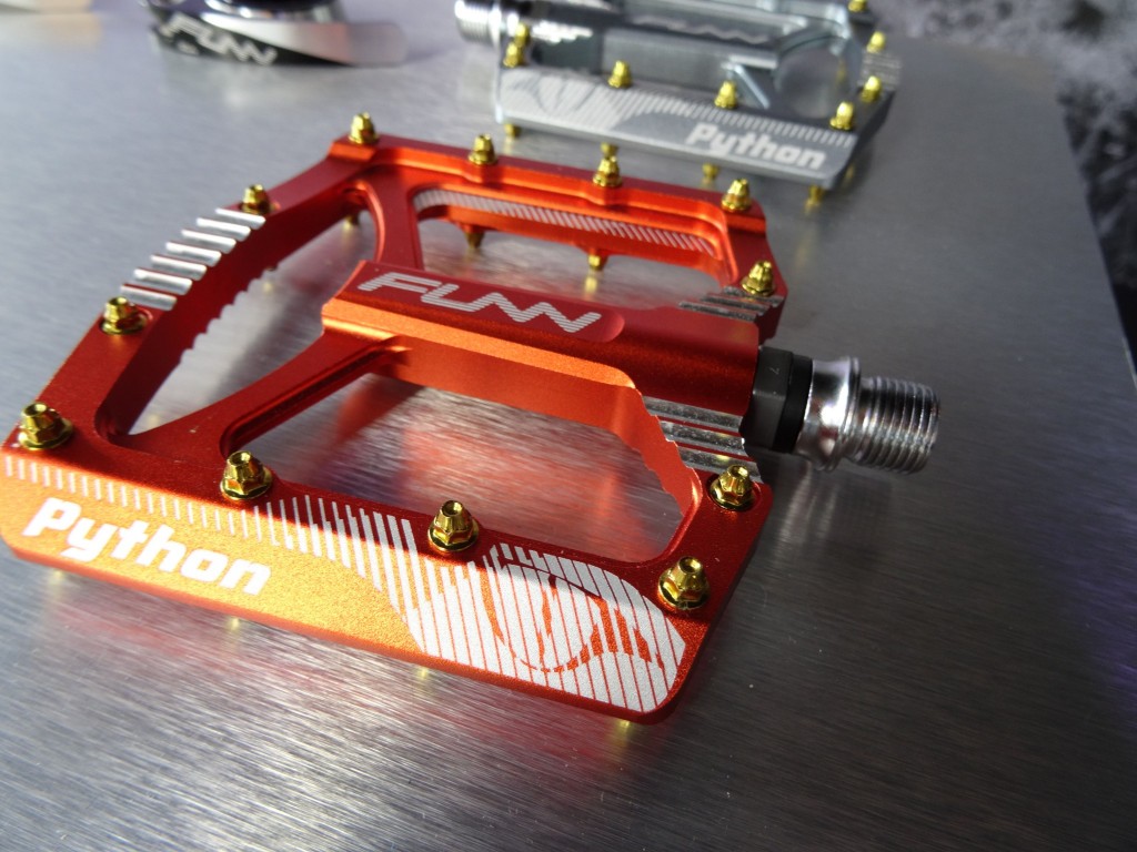 The pedal options from Funn include the Python, a wide strong and dangerously grippy flat pedal running on full cartridge bearings and weighing in at 375g a pair. For those who want clips we have the Mamba with a full metal cage outer and shimano compatible binding. Those who are still undecided can swing both ways with the single sided Mamba and get a flat pedal one side and clip on the other.