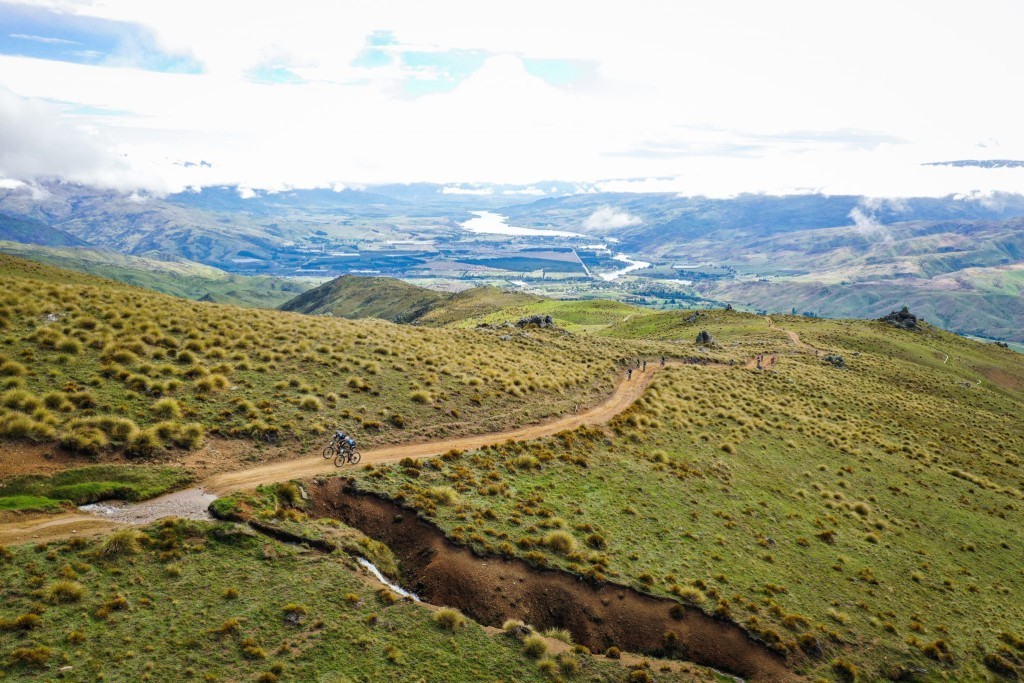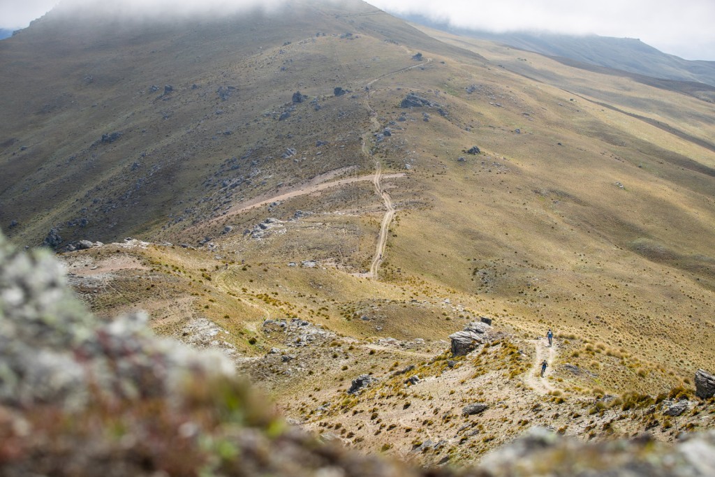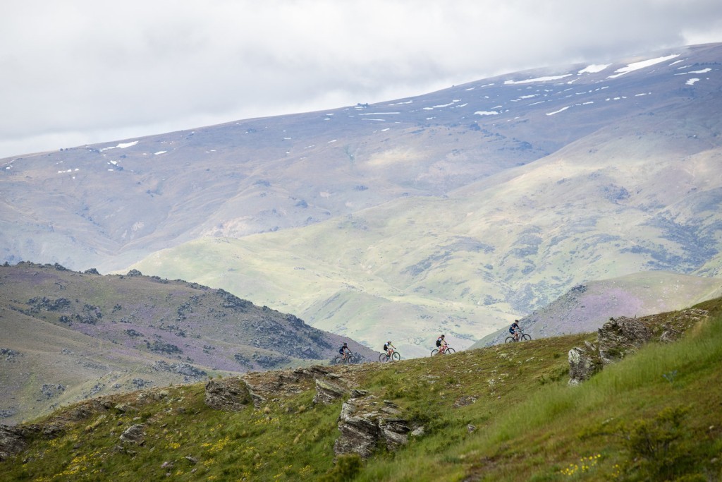 The final day kicked off with a short downhill road section which funnelled into a singletrack pinch, a recipe for a pile up if ever there was one! We used our magic Leader Jerseys to full advantage to start at the front of the bunch and avoid carnage. The Kawarau River Track was fun while it lasted, but we soon found ourselves on the slopes of Mount Michael, the biggest climb of the race with over a kilometre of vertical gain in 12 kilometres. It was like climbing into the heavens as we rode through the clouds to the misty tor-scattered tussock landscape of the tops.  The atmosphere was surreal (or I was hypoglycaemic) and it felt almost as if we were looking down on the snow-capped Remarkables in the distance. After traversing a few bogs, and gaining on some roadies in the process, the arms got a good workout on the sink-hole riddled descent high above the Roaring Meg River. At times it felt as though the course had been designed by walking along the Central Otago Pinot Noir shelf at the local supermarket.