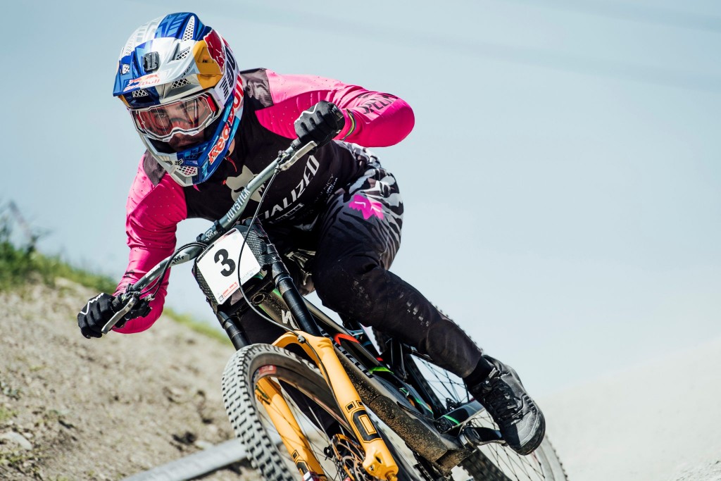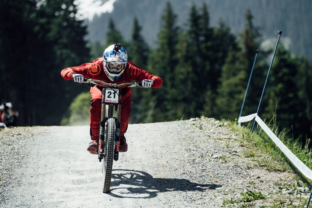 The USA’s Charlie Harrison initially held the hot seat, until world champ Loïc Bruni beat his time by over three seconds. Bruni celebrated in the finish area, but quickly declared that he didn’t think that he’d done enough. He felt that he’d left too much time on the fast middle section of the track.