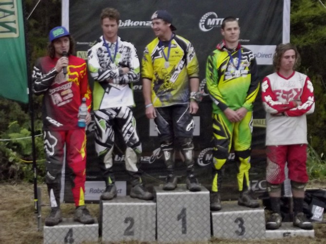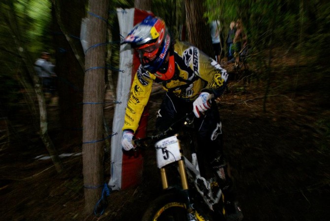 The Elite Men’s ranks were boosted this week with the addition of World Cup top ten regular Justin Leov (Dunedin) and former World Four Cross Champion Jared Graves (Australia), joining an already star studded field. 2007 Junior World Championship bronze medalist Mat Scoles (Alexandra) was the quickest seed in the earlier seeding run, and was last starter, with surprise package and second seed Bryn Dickerson (Wellington) away one before him. But the field had to be content with playing bridesmaid to Brook MacDonald (Napier), the 2009 Junior World Champion who put down a solid and what turned out to be unbeatable time from ninth seed. MacDonald was rightly very satisfied to win this one “its just great to be back winning again” all the comment needed to sum up his two days on Signal Hill. Putting down a clean run on the course was incredibly difficult considering the conditions, and a very vocal crowd was treated to some sublime riding from the top ten seeds in the Elite Mens field, in their chase after MacDonald’s time. Scoles would settle for second, with Kieran Bennett (Nelson) making a return to top three, and Dickerson not able to repeat his stellar seeding run, slipping to 11th. Leov raced well to make the top ten in his first race start this season, with his former World Cup teammate Graves not able to finish after a heavy crash at the top of the course. France’s Jerome Clementz was rewarded for an enjoyable month in NZ in his last race before returning to Europe, with a 7th.