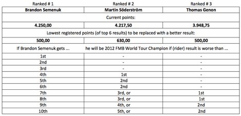 For example, the chart shows that if Brandon Semenuk places 7th at the event, then Martin Soderstrom has to place a minimum of 3rd to beat him, or Thomas has to win – otherwise, Brandon with his point advantage will be FMB World Tour Champion for the second consecutive time.