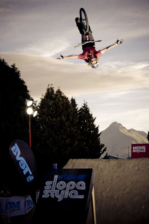 Based on last year’s, the course, built in 4 days from scratch in a car park close to the centre of Queenstown, was bigger and therefore faster with an extra feature at the end. Riders rolled in onto a kicker from the top of a high scaffold through a 15ft x 15ft drop straight to a quarter pipe and wall. The scaffold was a storey higher than last year, meaning riders will go faster and higher. From the wall, riders steped up to a wooden structure called a fruit bowl which generates a lot of speed and then step down to build up to the money booter – the mother of all jumps on the course where prizes are won and crazy tricks are thrown down!