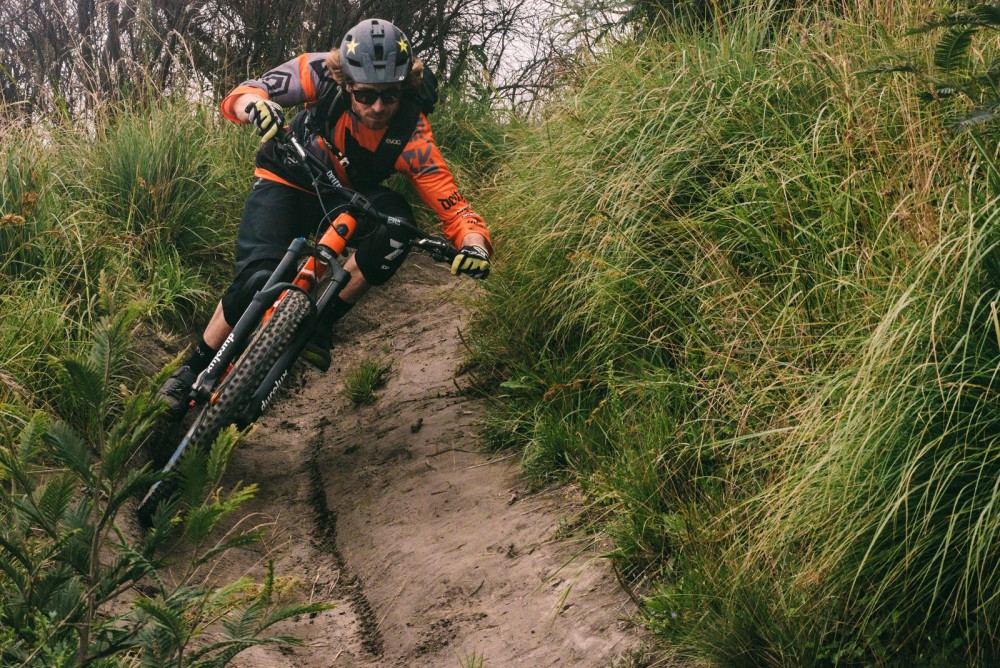 Below our camp was a steep knife ridge that flowed down towards the small town near the bottom of the valley. It had been an old trail at some point but was very grown in. We used small local farming tools to tuned up the old trail so that we could ride it for sunrise the next day hoping we could continue down into the valley below. After having a fire and camping out in an amazing spot with an active volcano roaring in the background we got up at first light and took first tracks down the spine below. With dew drenching the ground from the night the trail was perfectly moist.