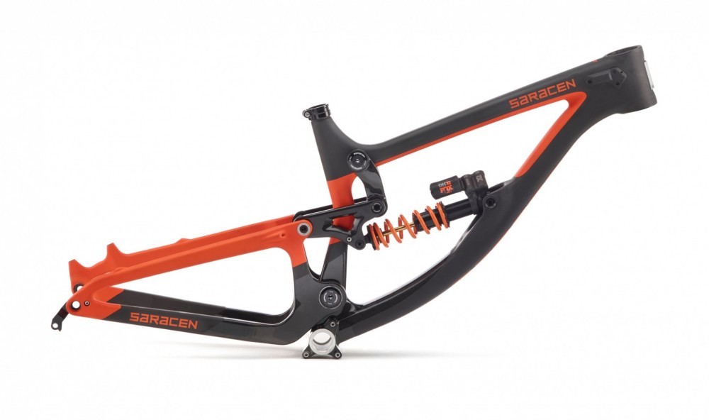 Saracen relocated the shock cradle to the downtube to lower the centre-of-gravity and improve the stand-over. This was perhaps the hardest task as the frame needed to accommodate the next generation of air-shocks coming through with large volume air cans.
