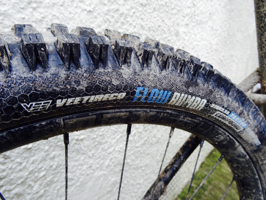 Vee tire, another brand quietly producing some great products including the 2.8-inch Bulldozer, the only plus-sized tyre I haven’t put a hole in yet. The Flow Rumba is their gravity tyre and comes in a bulletproof casing and a very aggressive profile weighing in at around 1200g it’s no lightweight, but that’s the compromise for a tough tyre. Other than ripping a side knob clean off, these have reliably kept rolling on the rockiest of terrain without a hint of sidewall damage, and although a bit dragging on the climbs, they are a truly tough tyre with a ton of grip.