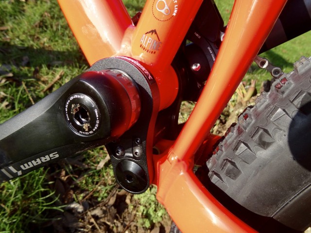 160mm front and rear, the Sled takes the Orbit link found on the Bolt and adds a linkage to give a virtual pivot system. Numbers are modern but not ground breaking, with a 65.5 head angle for smashing descents and a 74-degree seat angle to get you back up in comfort. Reach numbers on the Large are 462mm and the back end is a short 430mm, keeping things long and short were they should be.