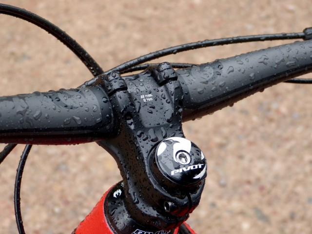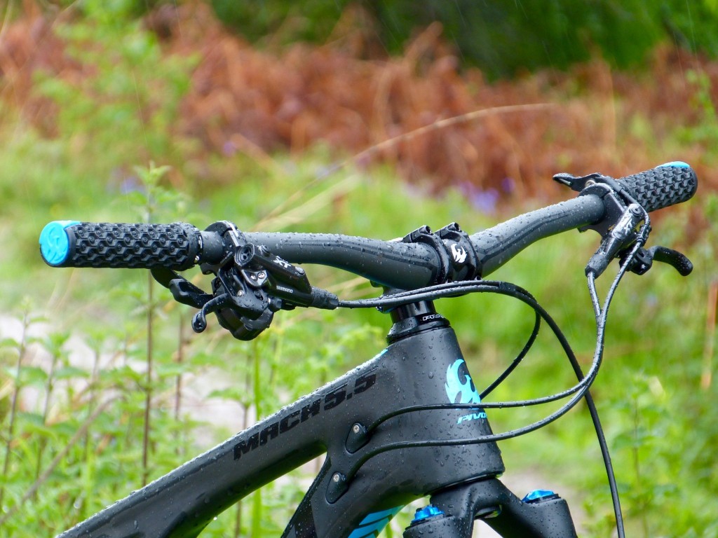 There are a few extra components worthy of mention on the Mach 5.5, as Pivot has collaborated on much of the parts involved. The Padloc grips feature throughout the range, and Pivot is fully committed to 35mm diameter clamping. Cutting the end of the bars at an angle may seem odd, but provides a non-twist grip with a superbly comfortable soft spot on the end of the bars.