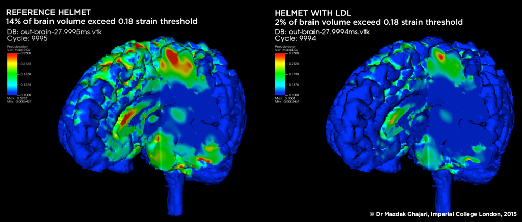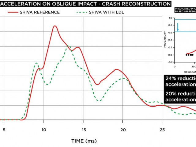 Comparing the Shiva Reference helmets with the Shiva LDL Advanced Liner helmets, the LDL equipped helmets experienced up to a 30% reduction in peak linear acceleration.