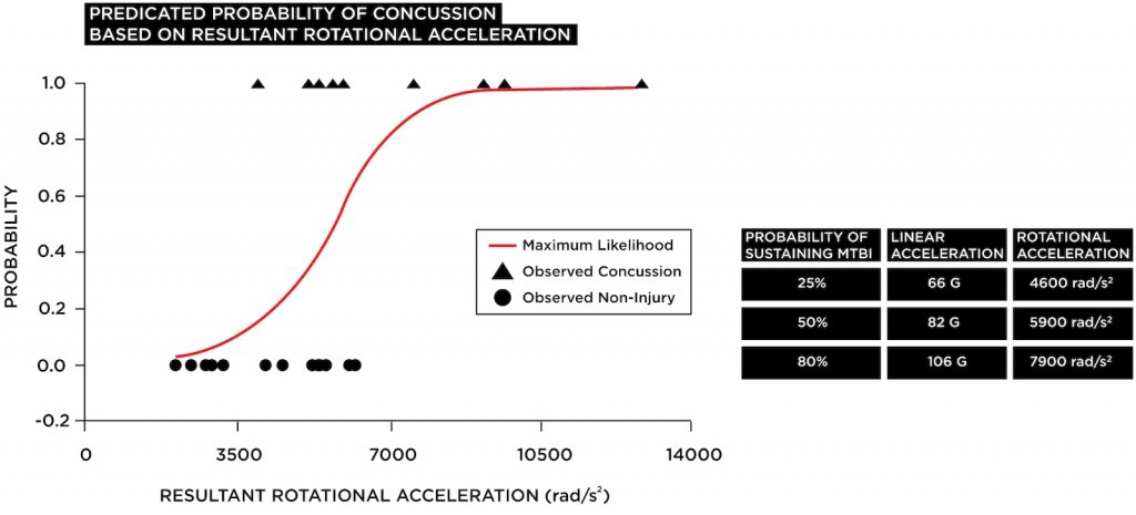 The crash data was used to create a controlled impact test that measured both linear and rotational acceleration. Angle and position were adjusted to emulate the Rampage crash exactly. The speed was derived from video footage and screenshot analysis. All rotational testing (before and after the Rampage crash) was administered in the same lab, on the same test instruments, by the same operators. Check the math out here.