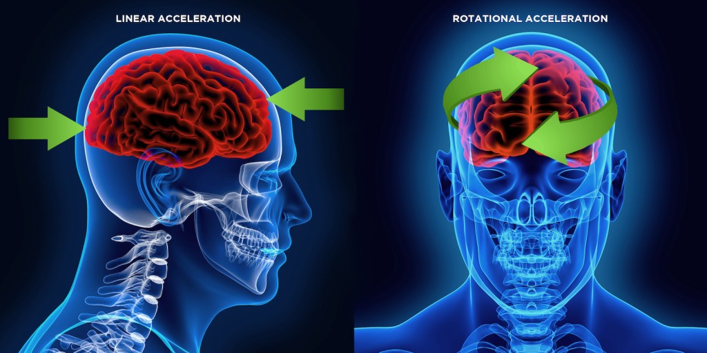 Linear concussions are the result of direct impacts that stop the head moving forward. Your brain, however, continues moving and collides with the interior of the skull, causing damage to either the frontal lobe or occipital lobe, or both. Rotational concussions result from lateral (oblique) impacts that spin the brain on its axis causing brain structures to tear.