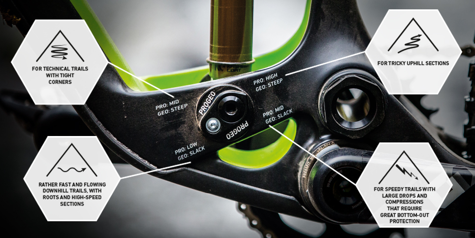 ProGeo offers you four different positions for the rear shock linkage. Whether quick-response or soft, a steep angle for technical sections or a flat one for speedy downhill rides – with ProGeo, you will quickly find the right setup. Generally, you can say that the more progression you have, the tighter the