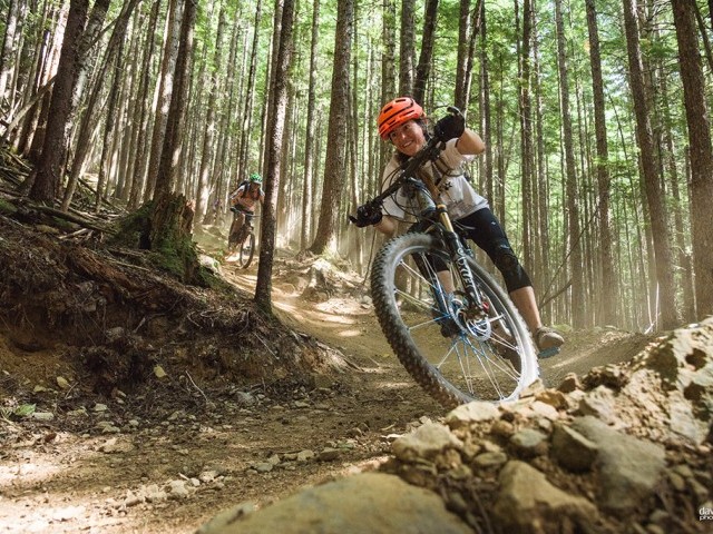 After eating lunch riders followed a route marked with the classic BC Bike Race pink tape flagging protocol, which allowed them to freely adventure out, unguided or with a guide on the all-mountain-esque Bluff Trails. A network of 37 trails, this area ranges from Green to Black Diamond, but the bulk (at 20 trails) are rated Blue.