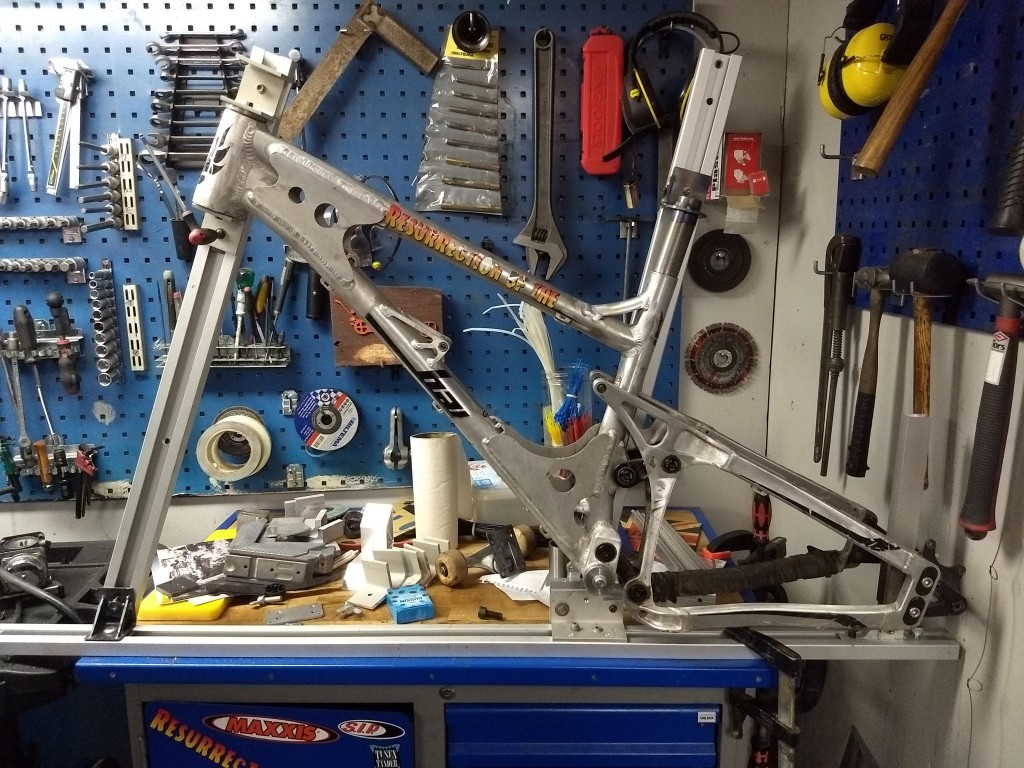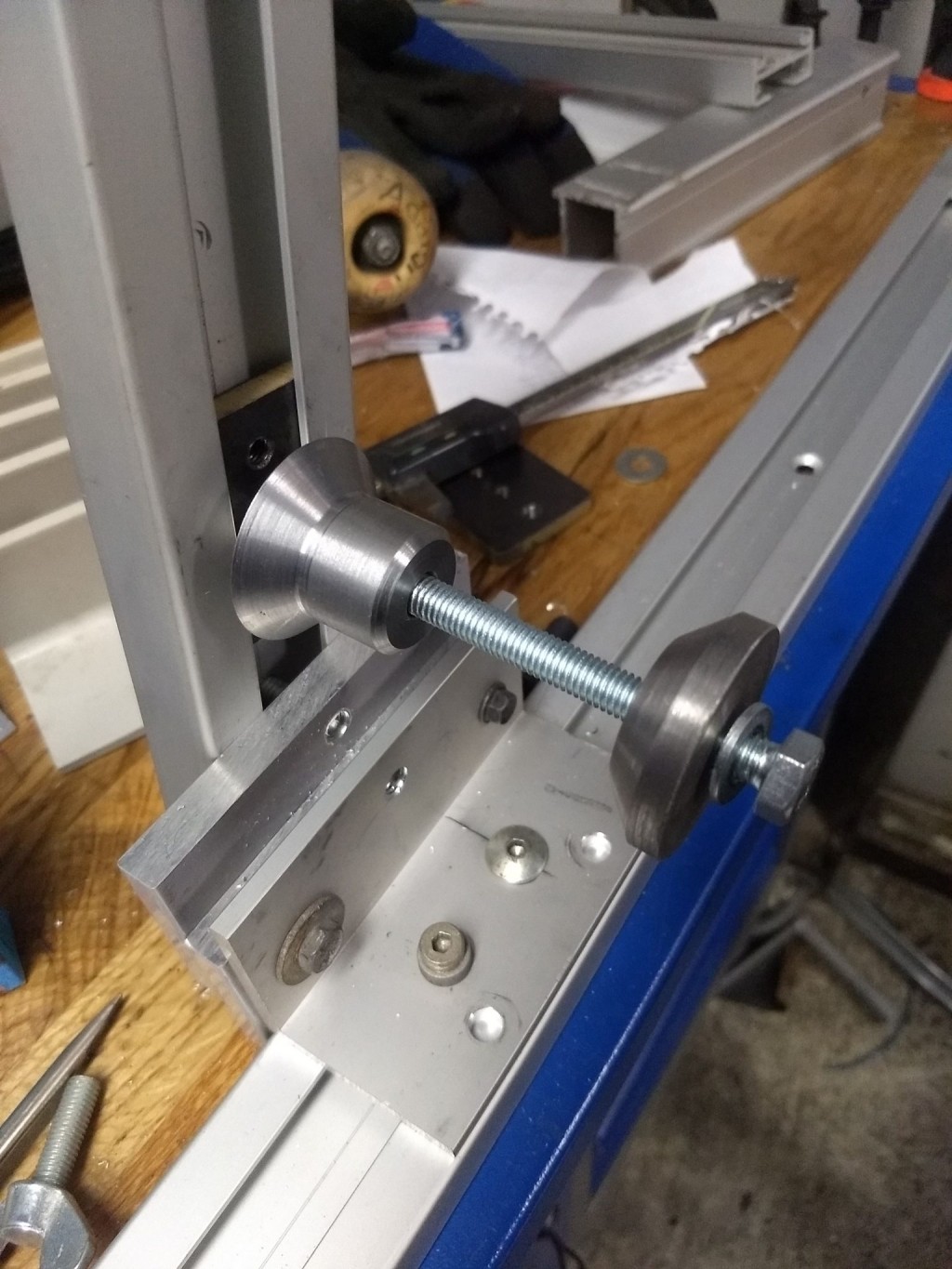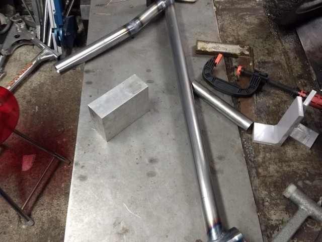I did once put on my Ragley front to it but that was only 2 pivot points to weld so this seemed like a good challenge. So first I had to build a jig, so my riding buddy that works with aluminum doors and windows got me some material – it’s not so stable but you can tack it up for strength. So after machining up some cones and stuff it was ready.