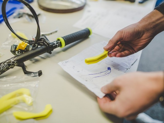 To better understand his needs and to enable practical testing MAGURA’s development department developed a prototype as a basis for testing. The “Loic-O-Mat”, as it was called, with a wink, is a combination of a permanently-mounted, aluminium base lever and 13 variations of 3D-printed lever shapes that could be installed and replaced quickly and easily. Loic tried out all the different shapes and lever ratios under real-life conditions and ultimately found his perfect lever form. On this basis MAGURA produced a perfectly tuned lever for Loic which was used at the world cup race in Fort William for the first time.